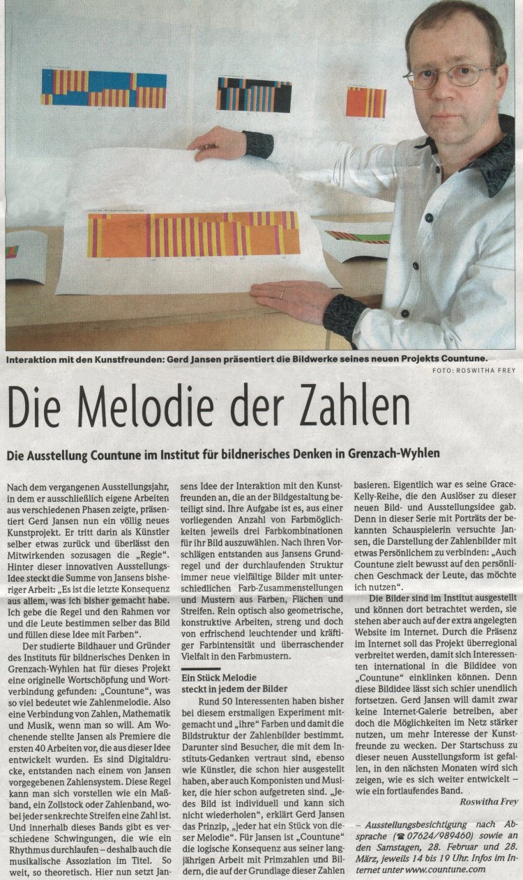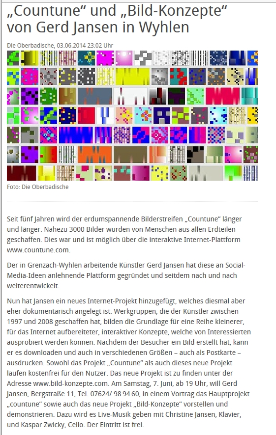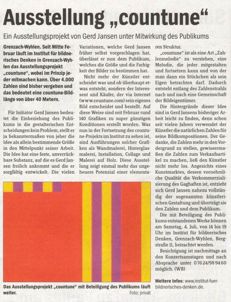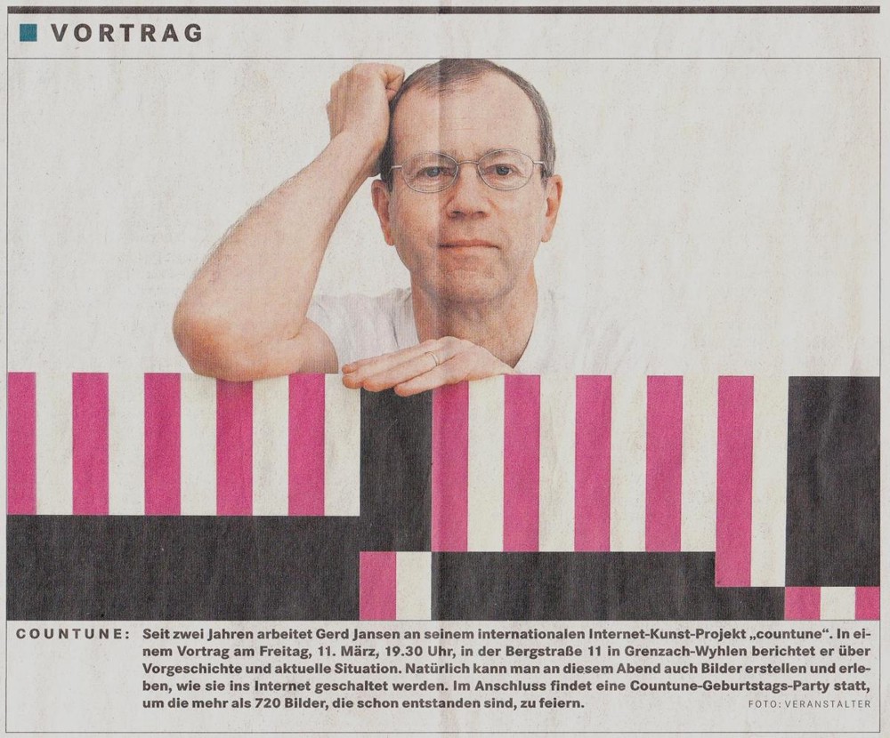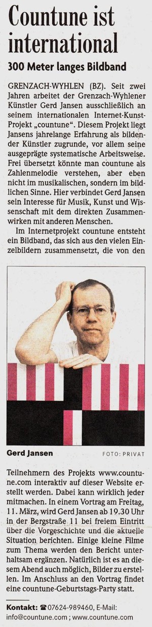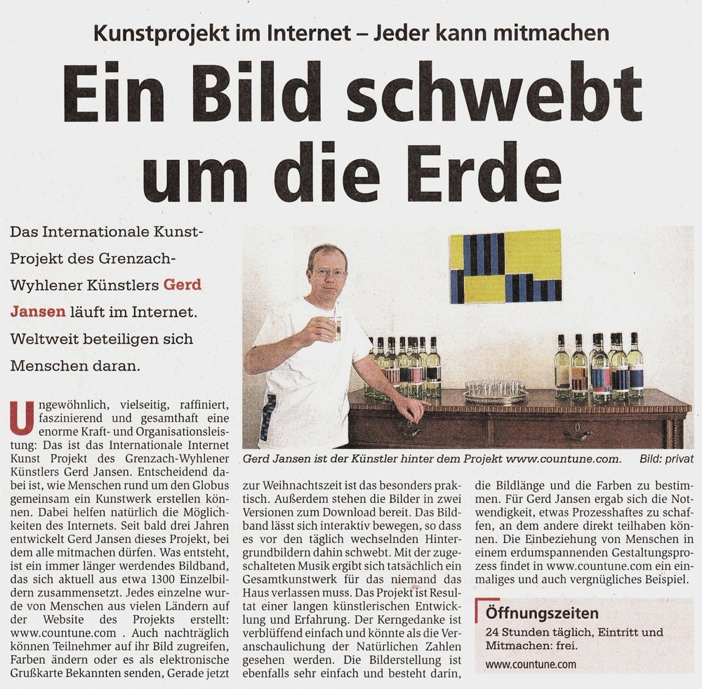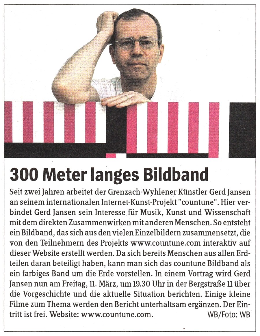 Vor vier Jahren gründete der Grenzach-Wyhlener Künstler Gerd Jansen das interaktive Internet Kunst Projekt "countune" und verlagerte damit die Ausstellungs- und Konzertangebote seines früheren regionalen Institut-Ausstellungsraumes auf die internationale Ebene des Internets... Read more...