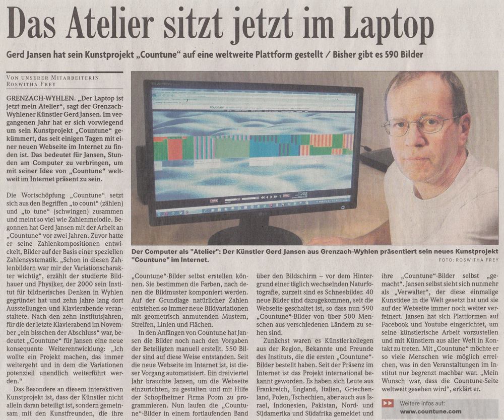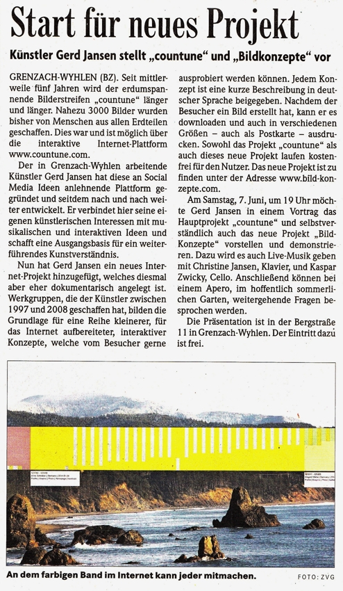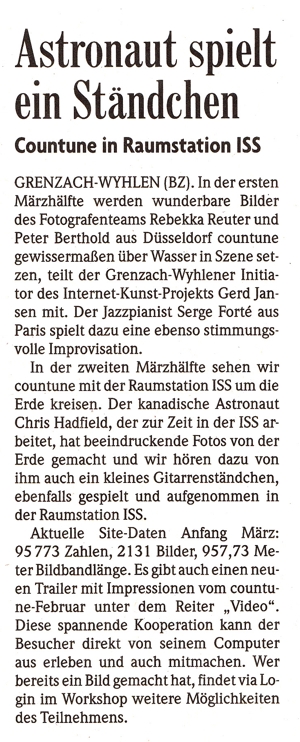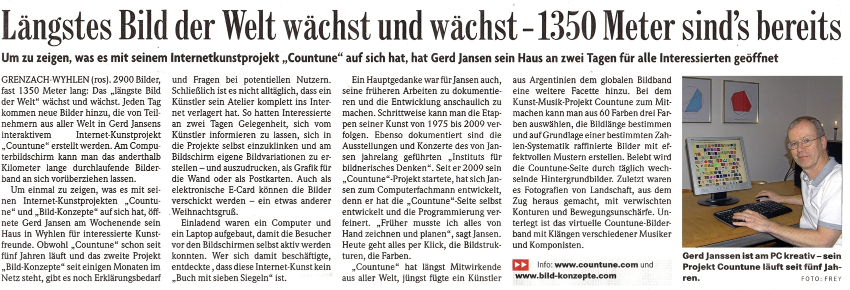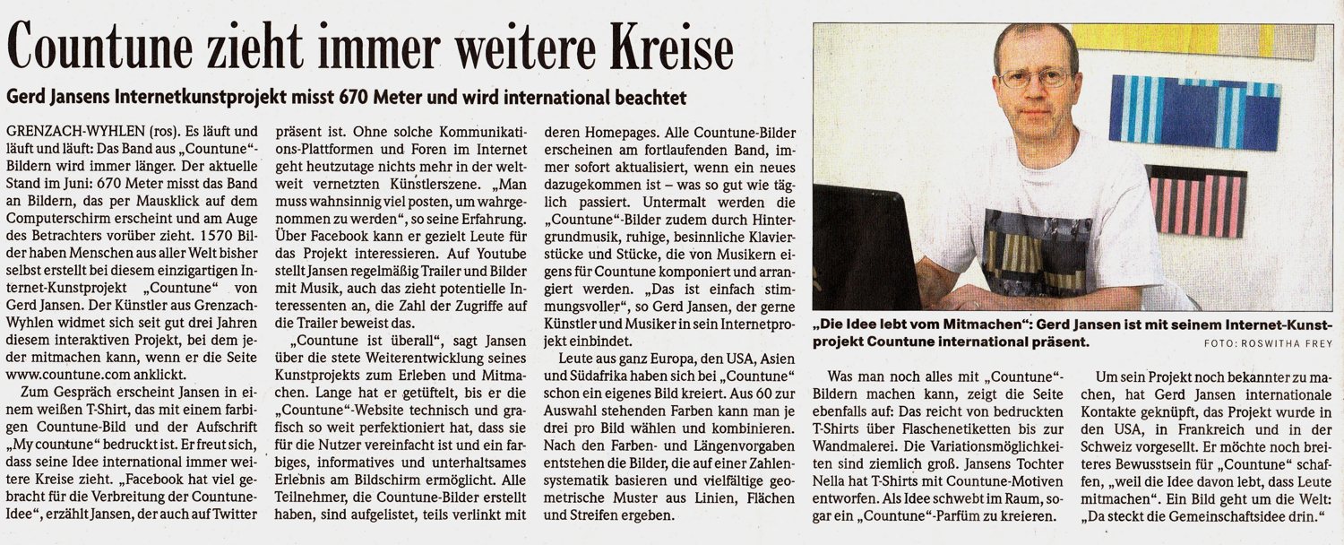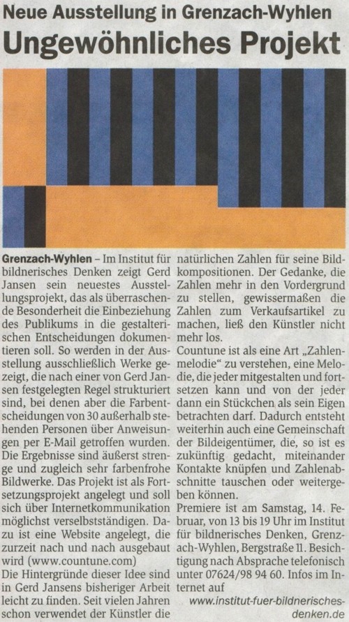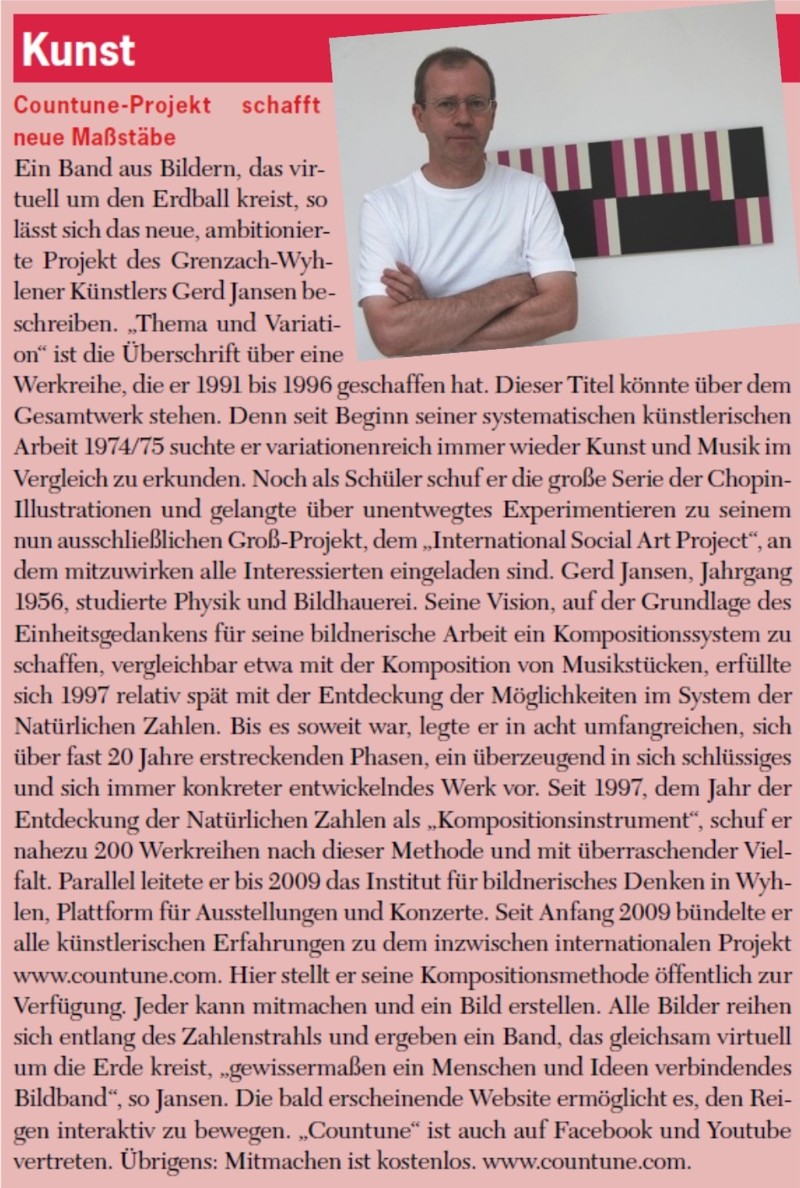 Vor vier Jahren gründete der Grenzach-Wyhlener Künstler Gerd Jansen das interaktive Internet Kunst Projekt "countune" und verlagerte damit die Ausstellungs- und Konzertangebote seines früheren regionalen Institut-Ausstellungsraumes auf die internationale Ebene des Internets... Read more...