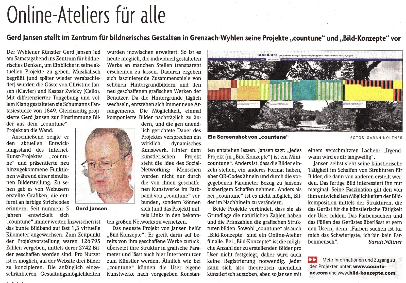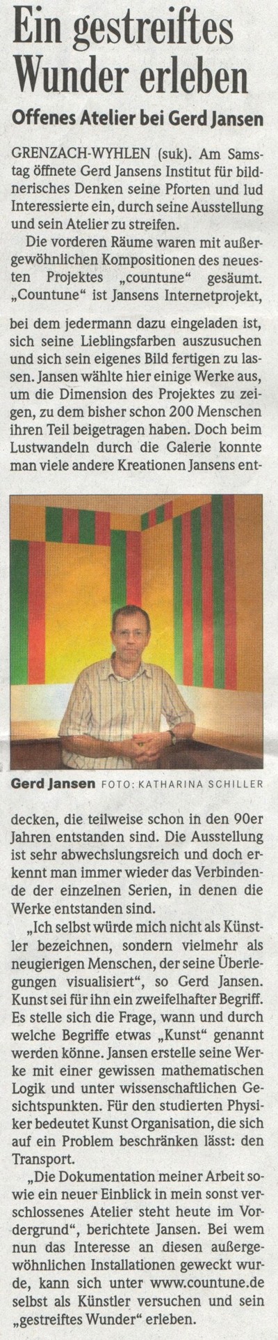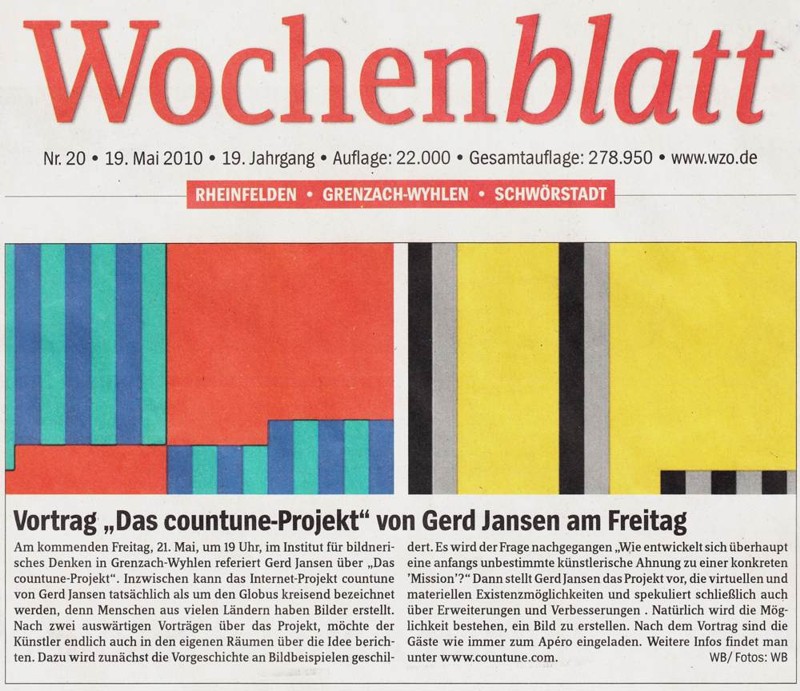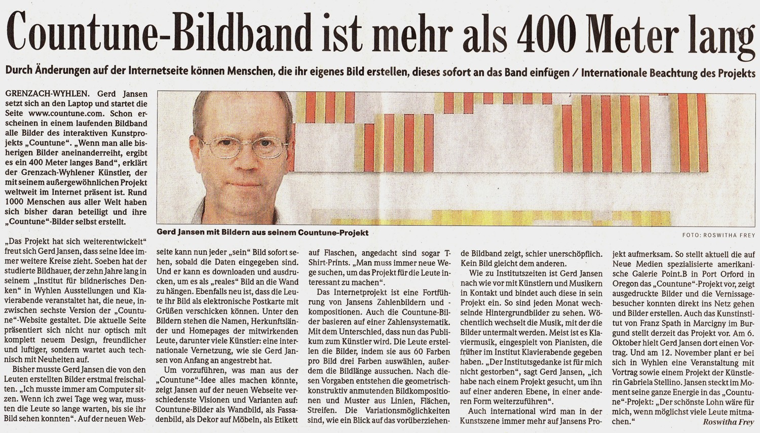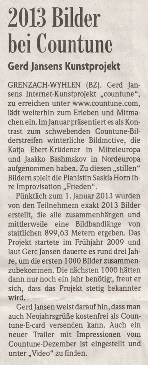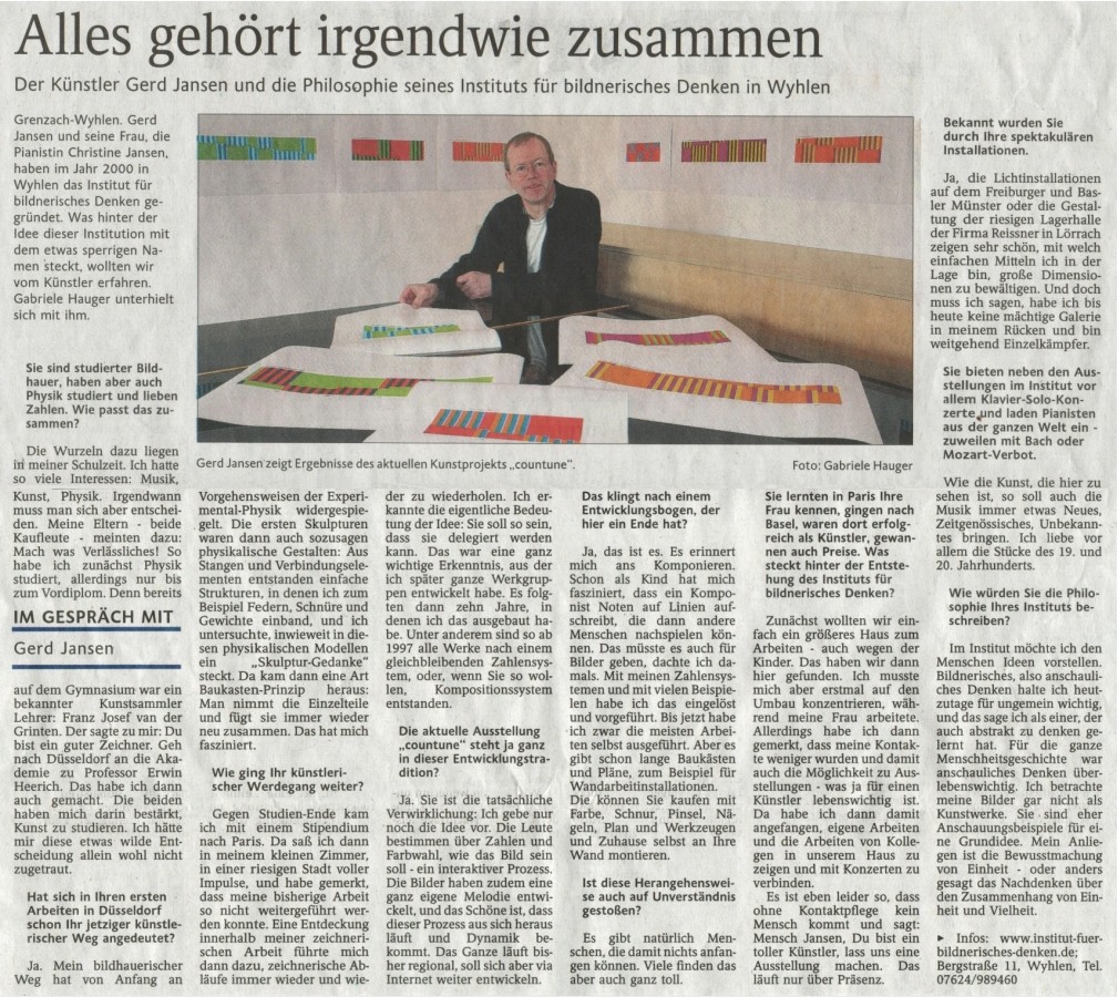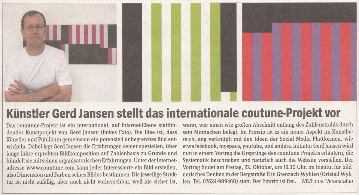 Vor vier Jahren gründete der Grenzach-Wyhlener Künstler Gerd Jansen das interaktive Internet Kunst Projekt "countune" und verlagerte damit die Ausstellungs- und Konzertangebote seines früheren regionalen Institut-Ausstellungsraumes auf die internationale Ebene des Internets... Read more...