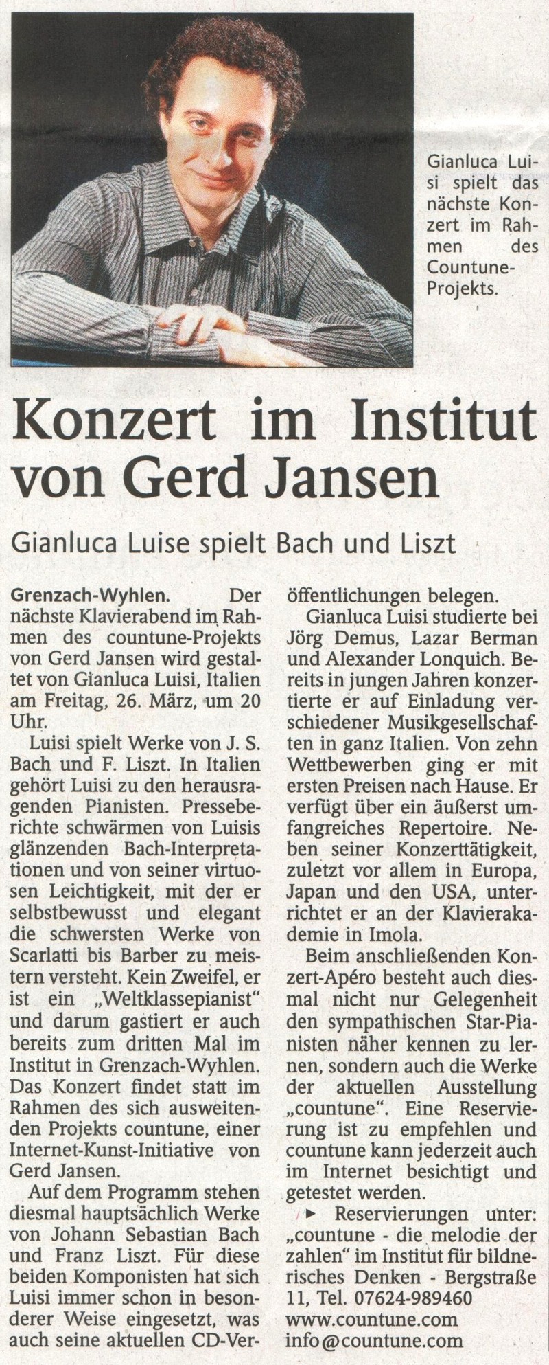Kein Zweifel, Gianluca Luisi ist ein Weltklassepianist und darum gastiert er auch schon zum dritten Mal im Grenzach-Wyhlener Institut. Das Konzert findet statt im Rahmen des sich ausweitenden Projekts countune, einem Internetprojekt von Gerd Jansen... Read more...