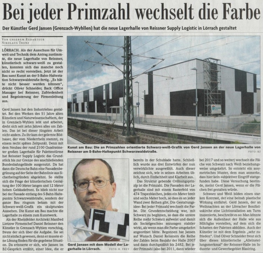 Gerd Jansen hat den Industriebau 'Reissner Supply Logistic' gestaltet. Bei den Werken des 51 Jahre alten Künstlers, der in Grenzach-Wyhlen wohnt und arbeitet, dreht sich seit zehn Jahren alles um Zahlen. Dies ist bei dieser jüngsten Arbeit nicht anders... Read more...