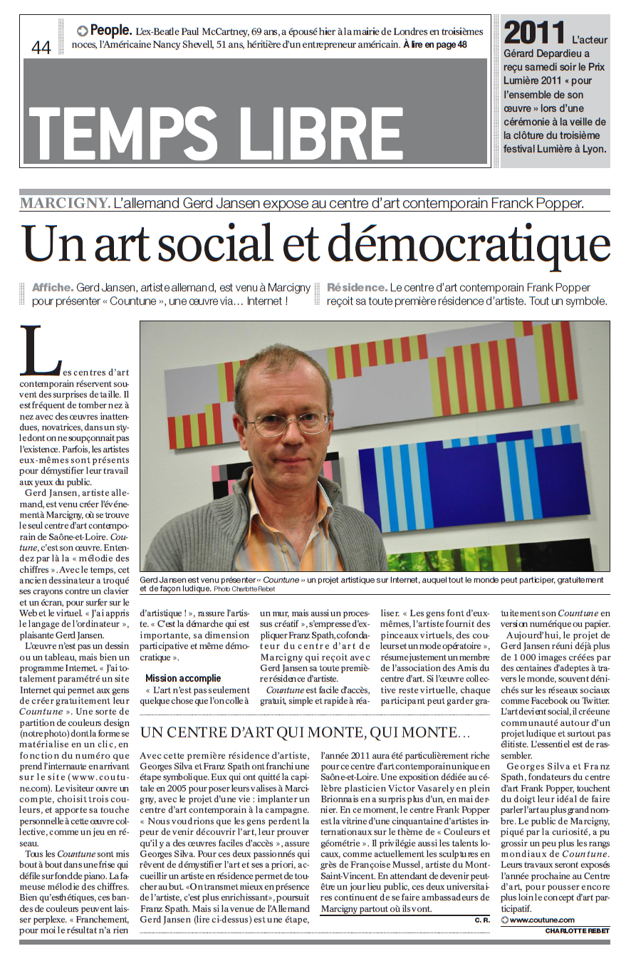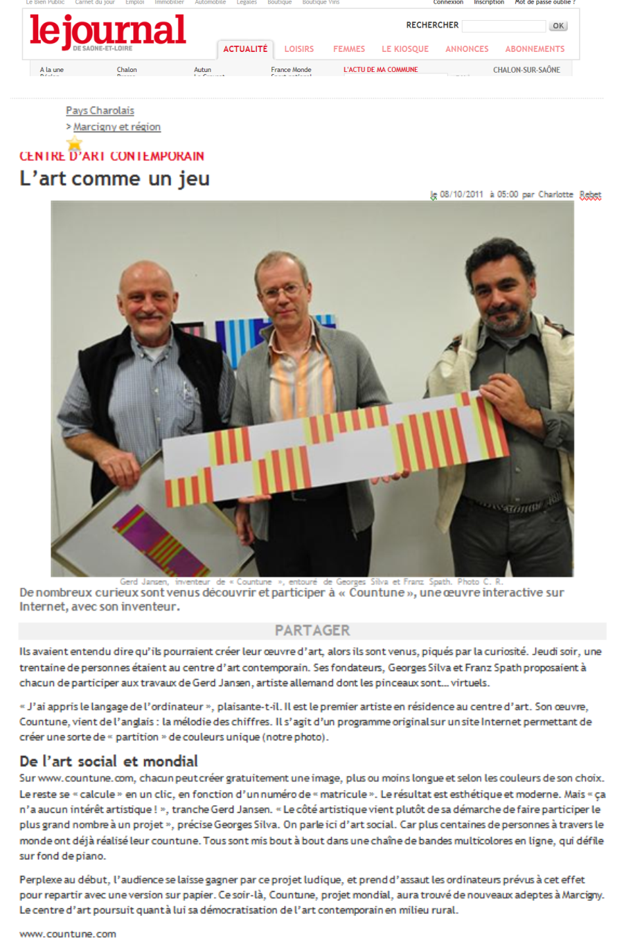 countune ist ein Internationales Internet Kunst Project. Jeder kann mitmachen und Bilder gestalten. Dies erlebten die Mitwirkenden während eines workshops in Marcigny im "Centre d'art contemporain Franck Popper" ganz direkt beim Zusammenwirken mit dem Gründer des Projects Gerd Jansen ... Read more...